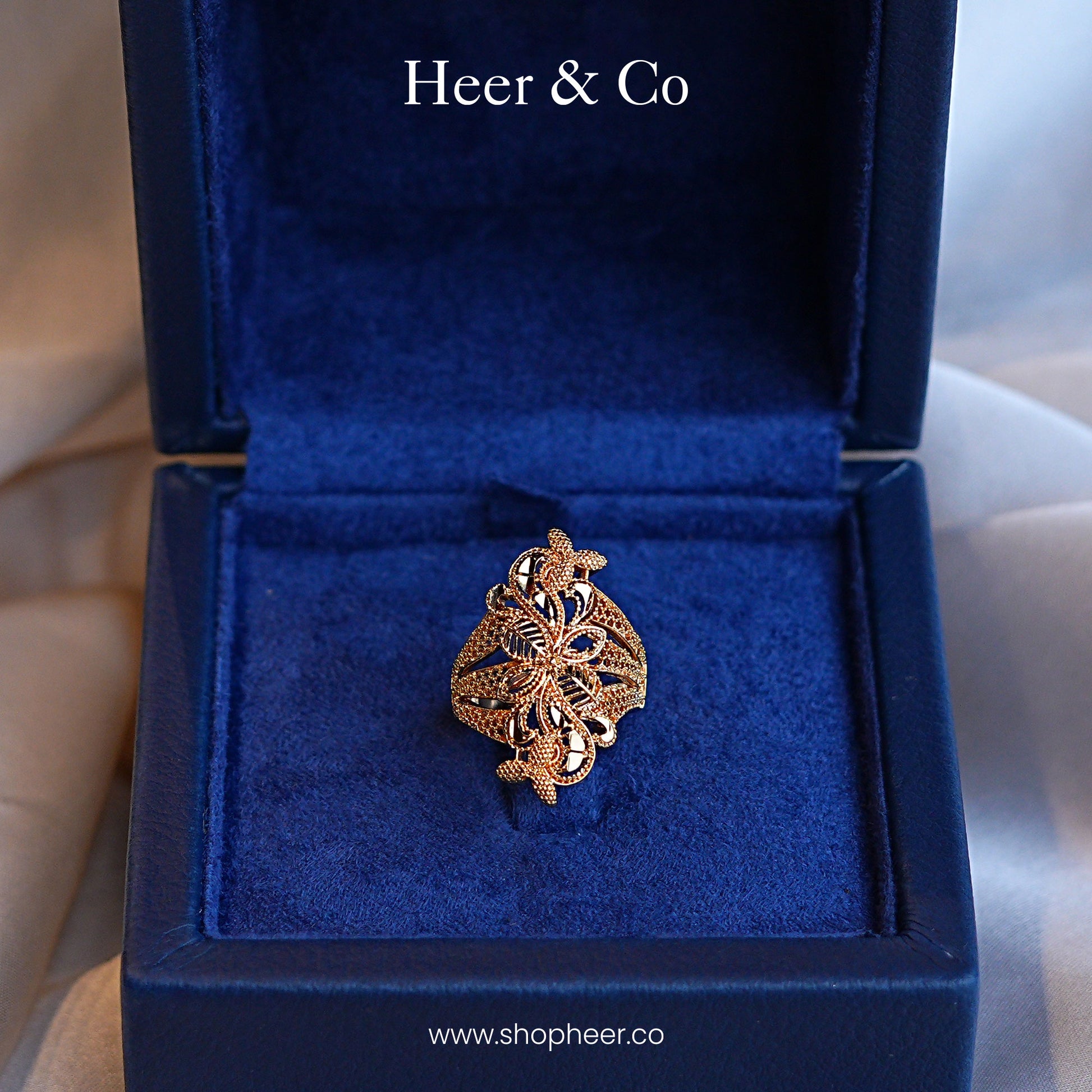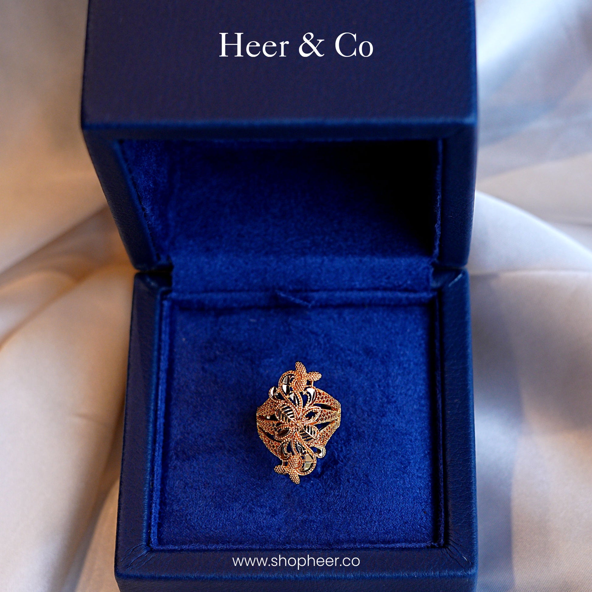 An intricate gold-tone statement ring featuring a mesmerizing filigree design of swirling, lace-like patterns accented with tiny, dark gemstones for a distinctly vintage look.