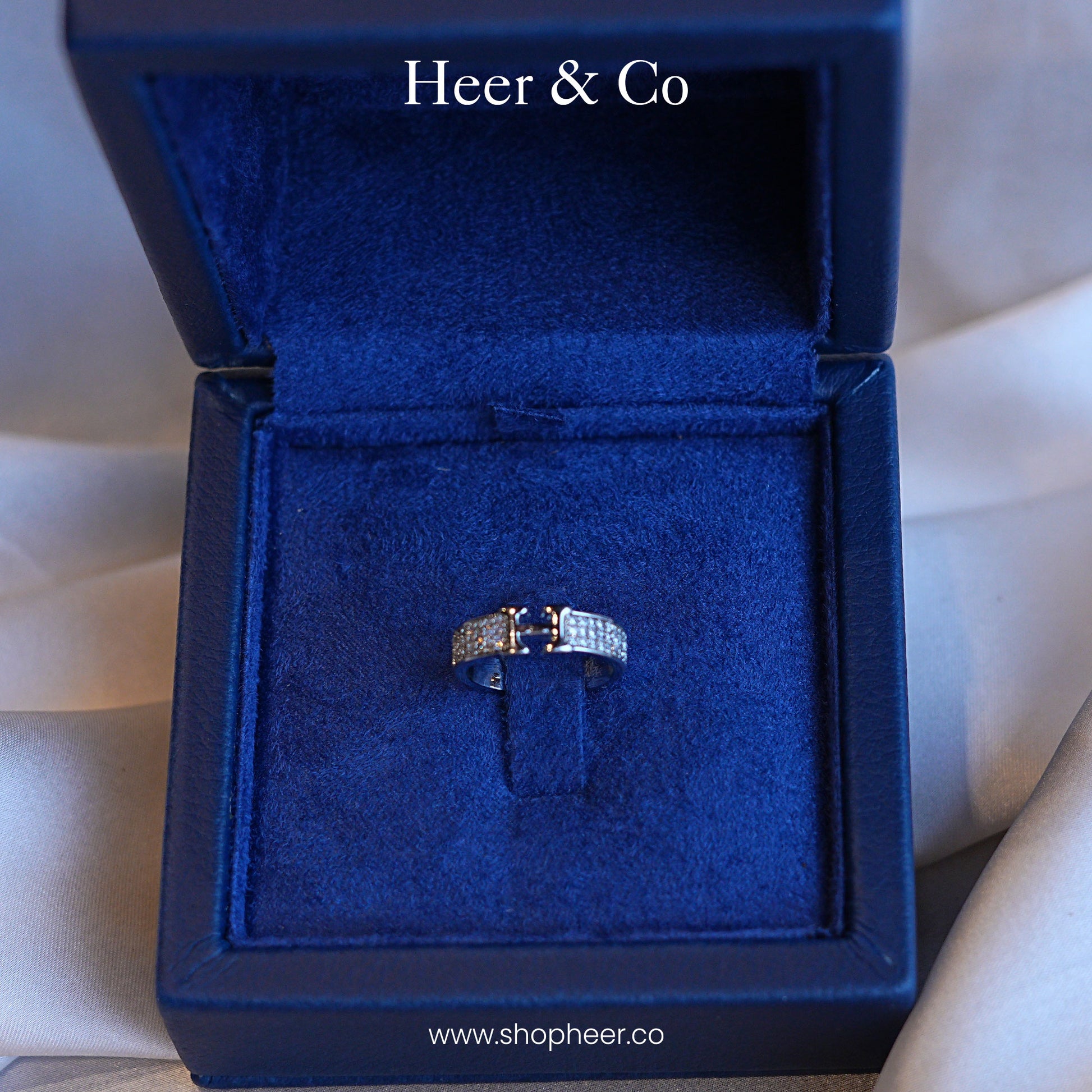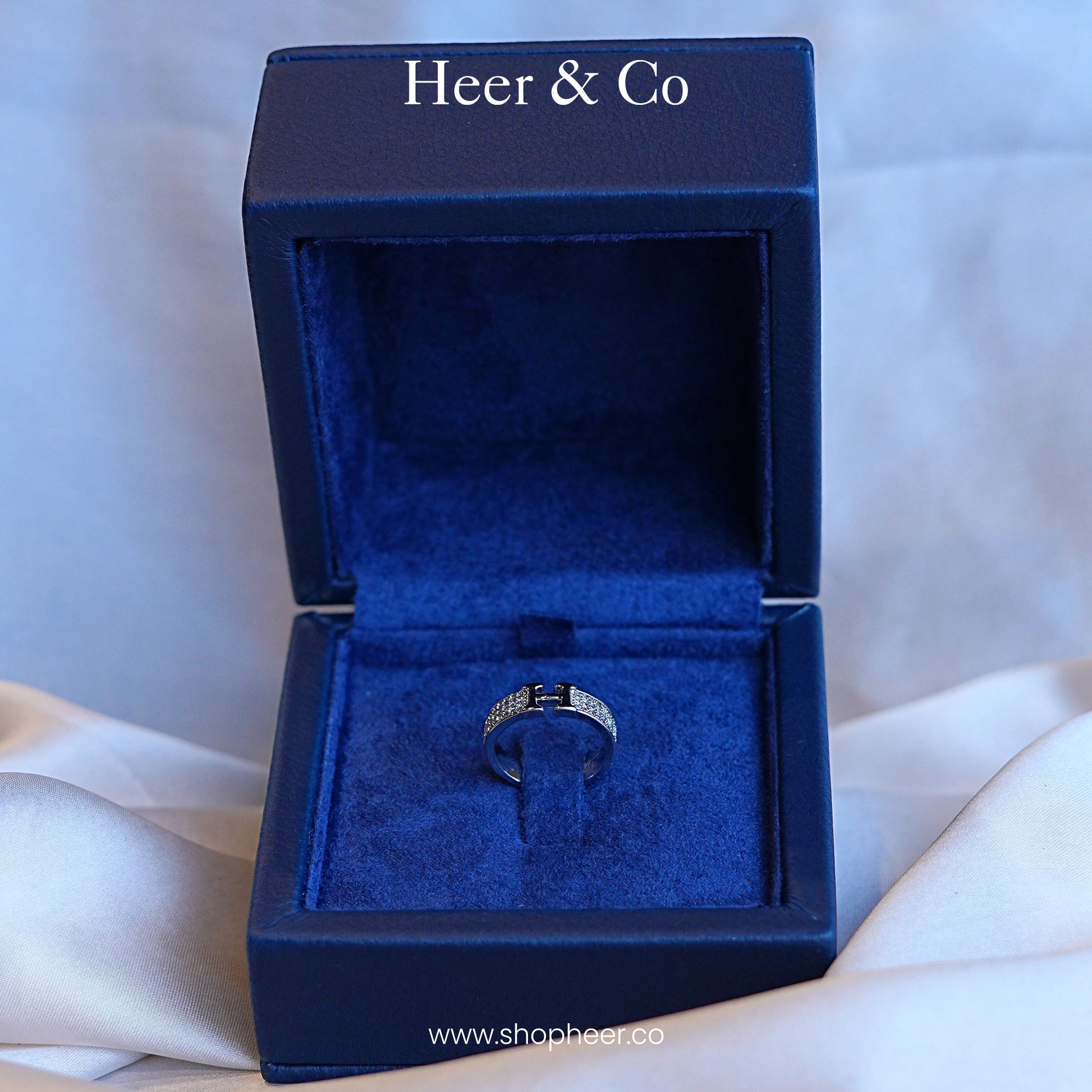 A contemporary wide band ring featuring a subtle central baguette-cut stone flanked by rows of dazzling pave-set round diamonds for a modern yet luxurious sparkle.